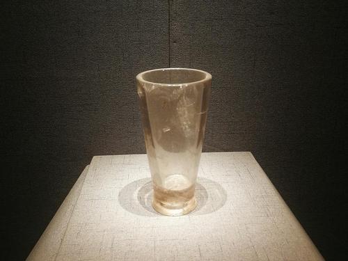 The Warring States (475BC-221BC) Crystal Glass has a height of 15.4 cm, a caliber of 7.8 cm, and a bottom diameter of 5.4 cm. The lip of the glass is open and flat; the body of the glass is obliquely flared; the bottom is round, and the heel of the glass is turned outwards, which is just like a modern glass. The whole body of the cup is plain and simple, transparent, and without ornamentation. And the glass has a light amber color. The surface of the glass is polished, and there are spongy natural crystals in the middle and bottom of the glass.