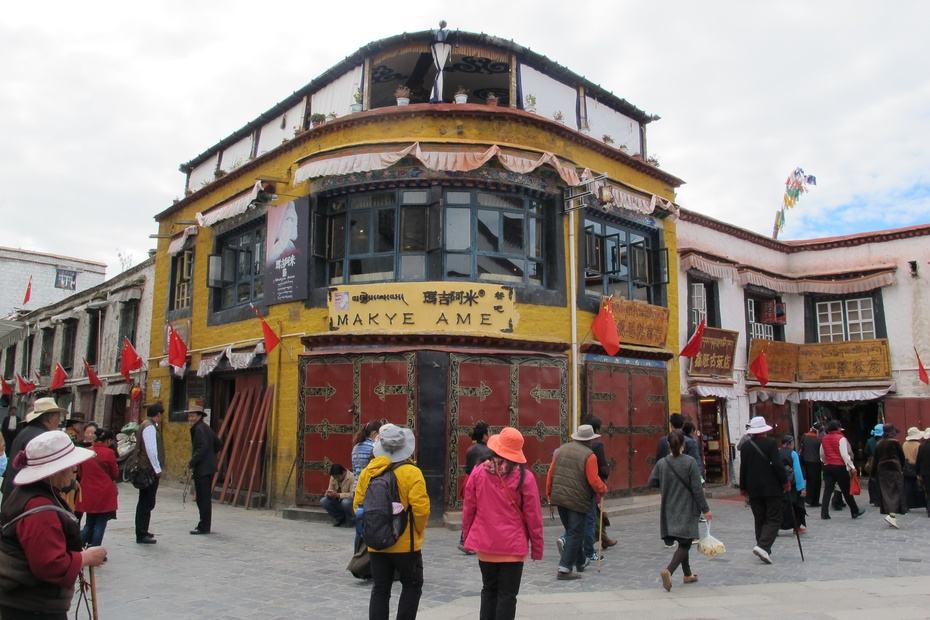On Barkhor Street, there is one place one should not miss: the Makye Ame. It is a small restaurant with a bar. It used to be the secret palace of Tsangyang Gyatso. Most of the buildings on Barkhor Street are white, except for this two-floor building covered in yellow walls at the southeast corner.